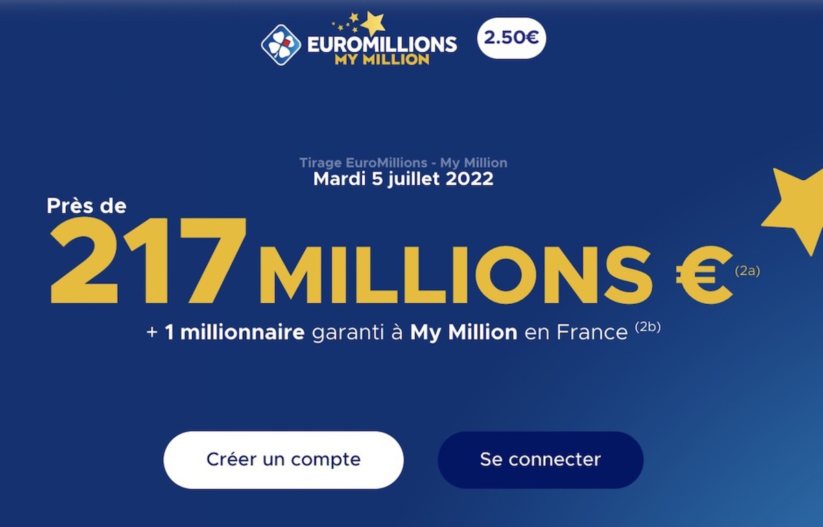 . Bonne chance à tous. Prochain tirage Euromillions My Million du mardi 12 juillet 2022. 230 millions deuros étaient à remporter ce mardi 12 juillet 2022 pour ce nouveau tirage de lEuromillions organisé par la Française des jeux.